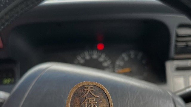 江戸時代の古銭「天保通宝」 トヨタ車ハンドルのエンブレムに重ねたら…まさかのピッタンコ! 偶然の一致に親子大はしゃぎ