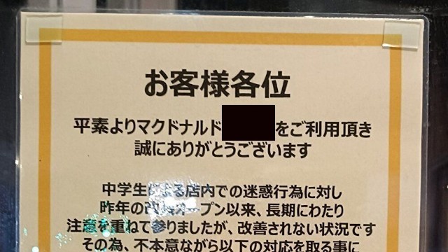 マクドナルドが中学校2校「出入り禁止」「長期にわたり注意を重ねてまいりましたが」店舗に出禁貼り紙