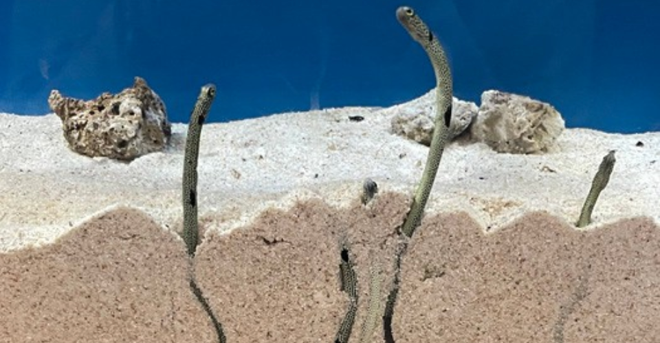 企画展はその名も「寿司ネタ大集合~水族館が斬る!寿司のいろいろ~」(6月2日まで)。寿司ネタを扱ったのは27年の歴史で初めてといい、「これまで魚やウミガメ、ペンギンなど愛らしさや不思議さなどをクローズアップした企画をしてきたんですが、やり尽くした感があり、タブーを逆手に取ってみたら面白いかも?と半分勢いで企画しました」と担当職員。のれんをくぐると六つのコーナーがあり、マダイやシマアジ、スズキなどが泳ぐ水槽の前にはおいしそうな寿司のレプリカが。ホタテの寿司を、世界最大の二枚貝オオシャコガイ(絶滅危惧種!!)で作ったら何貫できる?-など、「いたって真面目に制作した」という展示が並ぶ。担当チームは飼育歴10年以上のベテランばかりといい、海の生物への愛も深く、添えられた解説文には「カワハギはおちょぼ口でユニークな動きですが、実はほかの魚のヒレをかじる厄介者」など「ネタ」たちの生態を熟知しているからこそのトリビアが記されている。