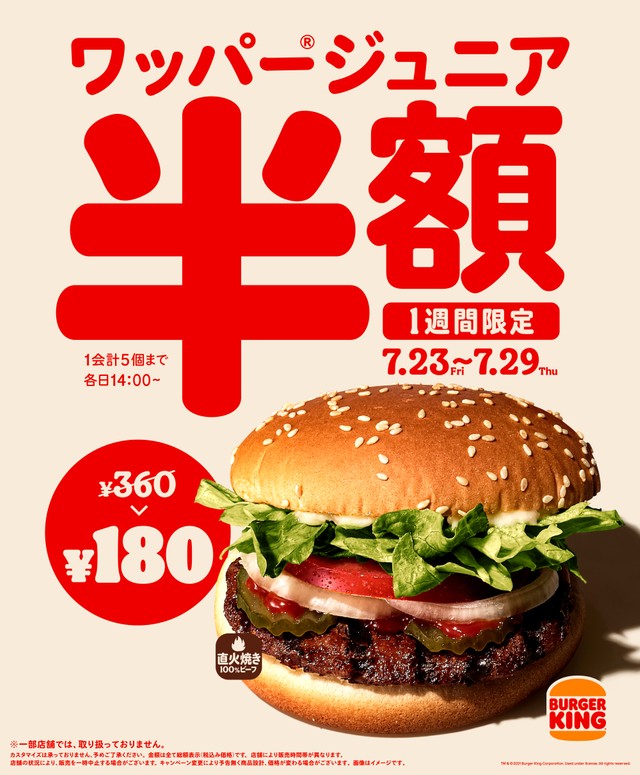 株式会社ビーケージャパンホールディングス(本社・東京都千代田区)は、バーガーキングの看板メニューであるワッパージュニアを半額の180円で販売すると発表した。1週間限定(7月23日~29日)で各日14時から、1会計につき5個まで購入可能で、店内飲食・テイクアウトのいずれも対象。