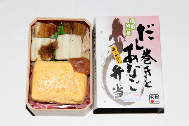 弁当の半分の面積がだし巻き卵という、数ある駅弁の中でも群を抜く一枚物の卵焼きと、卵の量にド肝を抜かれる。アナゴは定番の焼きと白焼きが2切れずつ。別添えの塩で味変させ、4種類のテイストを楽しめるようになっている。白焼きの上にはちりめん山椒がのって色や味にも工夫が凝らしてあり、副菜が入らず、予想を超えるメニュー通りの二大看板が競演。ボリュームがあって印象に残る駅弁に仕上がっている。