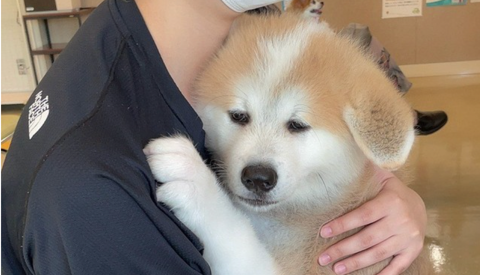 生まれて初めて注射を受けるため車に乗り込んだ瞬間、いつもと違う気配を察し、すべてを悟った顔になっていた秋田犬の子犬、レオくん。