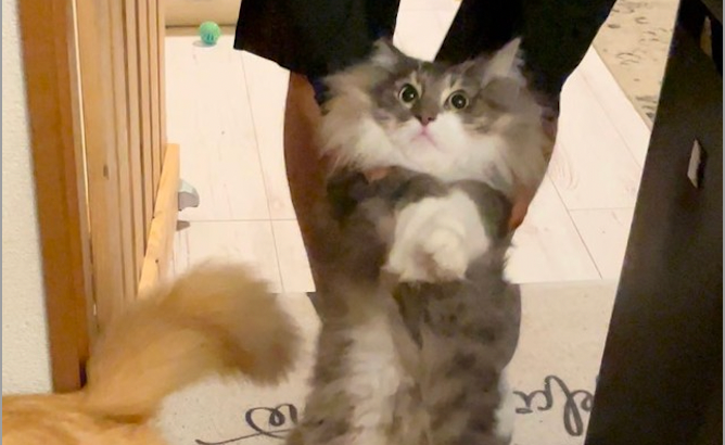 こんなつぶやきとともに、1枚の写真をツイッターに投稿した「ネコランド」(@NEKOLAND13)さん。そこに写っていたのは、女性の背中に取りついたモフモフの背後霊!ではなく・・・猫ちゃんの姿!