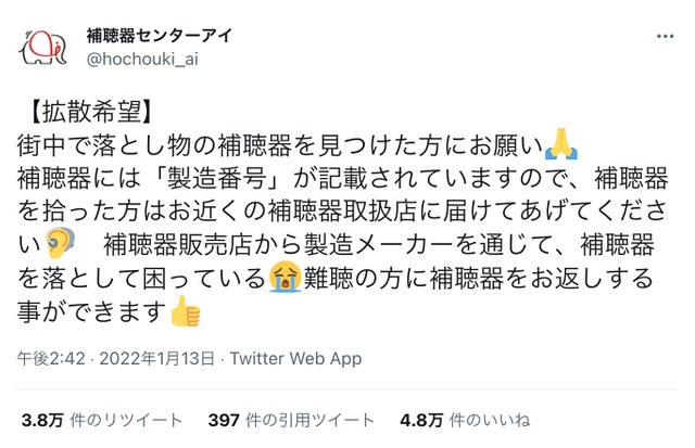 「補聴器を拾った方は、近くの取扱店に届けて」呼びかける投稿が話題 「交番ではダメなの?」… 警察庁の見解は