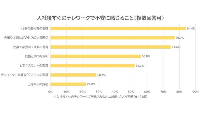 入社後すぐのテレワークで不安に感じることは「仕事の進め方の習得」が84.0%で最多。次いで、「先輩や上司などの社内の人間関係」76.9%、「仕事で必要なスキルの習得」74.6%と続きました。