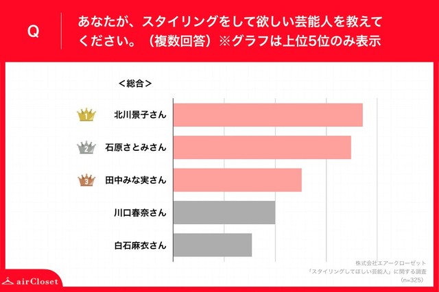 新しいファッションに挑戦したくなる春、もし憧れのあの人にスタイリングしてもらうなら…。日本初・国内最大級の女性向け月額制ファッションレンタルサービスを展開するエアークローゼット(東京都)は、洋服のコーディネートを提案するスタイリングをテーマに、20代〜40女性325人に「スタイリングして欲しい芸能人」を聞きました。花見やデート、入園式などさまざまなシーンで、ファッションをアドバイスしてほしい芸能人は?