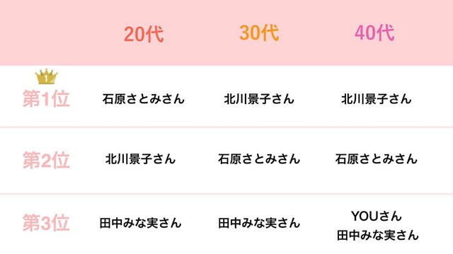 総合1位は北川景子さん。20代では石原さとみさんに1位を譲りましたが、30代、40代ではトップでした。「美人でクールビューティーなイメージを参考にしたい」(30歳)「オフィスカジュアルがうまそうだから」(29歳)と多数の女性の憧れの的です。