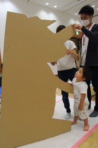「ピカチュウがよがっだぁぁ」。作業が大詰めを迎えたころ、男の子の泣き声が響いた。チームではゴリラを作っていたが、ピカチュウも作りたかったのだという。機転を利かせたスタッフが予備の段ボールを用意。母親がどのチームよりも早く作り上げ、笑顔を取り戻していた。