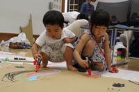 講師を務めたのは、アーティストユニット「KOSUGE1-16(コスゲイチノジュウロク)」として、巨大紙相撲を全国に広める土谷享さん(45)=高知県佐川町。自転車をこいでミニチュアの競輪選手を動かすレースゲームや、子どもが乗れる大きさのサッカーボードゲームなど、コミュニケーションを生むアートをテーマに各地で創作やワークショップを続ける。巨大紙相撲の全国巡業(ワークショップ)は2004年から始め、50場所以上で開いてきた。