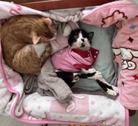 「ご飯の時は、お兄ちゃん猫がいつも近くにそっと座り、見守っています。残ったご飯の処理は任せてほしいみたい(笑)。他の猫と添い寝をしていることもよくある。狭そうですが、嬉しそうです」