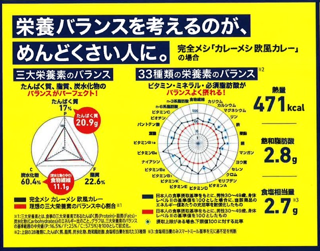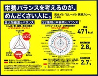 「完全メシ」とは、見た目や味わいはそのままで栄養バランスが考えられた食品。厚生労働省「日本人の食事摂取基準」で設定された33種の栄養素とたんぱく質・脂質・炭水化物をバランスよく摂取できる。「インスタント食品なのに管理栄養士の9割が推奨」「栄養バランスを考えるのが、めんどくさい人に。」というコピーも忙しい現代人には魅力的だ。