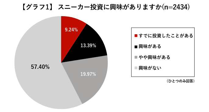 投資をしている人でも、スニーカーには「興味がない」との答えが過半数。だが、1割程度はもうスニーカー投資をはじめているという結果。これを多いと見るかどうか?
