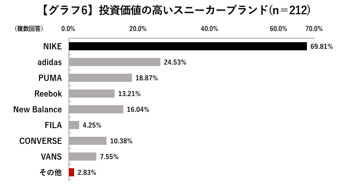 では次に、スニーカー投資をしたことがあると答えた212人を対象にした調査を見てみよう。気になるのは、どこのブランドのスニーカーを狙うか。