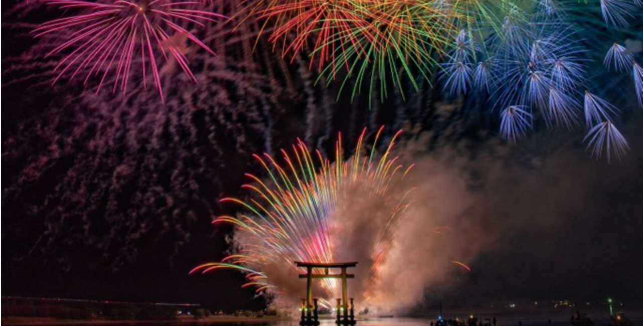 滋賀県では白髭神社の大鳥居を背に打ち上がる花火を撮影。打ち上げ場所を鳥居の中心に合わせるため、工夫して撮影されたそうです。
