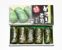 日本海の荒波にもまれ富山湾に入ってくるブリは「神鳴のブリ起こし」の言い伝えで知れ渡るほど有名で、富山に旅行すると氷見のブリなどをしゃぶしゃぶで食べさせてくれる。昭和32(1957)年に駅弁販売業者の源が「富山のおいしい食材を使った料理で多くの方に富山を知ってもらいたい」との思いで発案し誕生したのが「ぶりのすし」だ。パッケージには青物らしく青色を基調にしたブリの絵がイラストレーターの吉田カツ氏によって描かれている。中には直径約18センチの円形ワッパで高さ2センチ強の容器が入り、竹2本1組を輪ゴムで挟み込んだ押し寿司になっている。