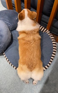 「ムッチリボディのおっとりさんですが、スイッチが入るとコーギー特有の活発さが出てきて、いつもコーギースマイルでみんなを笑顔にしてくれます。特に、コーギーの特徴の短い脚は最高で、ソファの上で短い脚を投げ出してツチノコになったり、仰向けでカエルみたいにひっくりかえったり、なんとも言えない魅力があふれています」