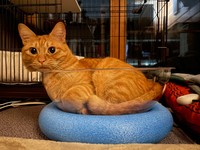 「自作のキャットタワー用に購入したのですが、開封したらゆたがすぐに入って、すっかり気に入ったようなので床に置いて使っています。このままだとぐらついてうまく入れないので、プールヌードルを丸めたものを下に置いています」