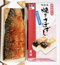 シンプルな掛け紙に竹の皮を模した包みにくるまれた駅弁。開いて中身を確認すると幅2センチ、厚さ最大1.5センチにカットされたサバが酢飯にのっている。掛け紙に書かれた「捕れたてのさばをていねいに焼き上げました」の文字が伝えるように、ご飯まで焦げ目がついて実においしそうな仕上がりとなっている。深くて赤いモミジのバランがマッチして色みがいい。