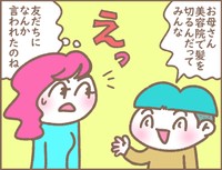 憮然とした表情でMさんに報告する長男。どうやら母親の散髪を友だちにからかわれたようです。Mさんは「おうちで髪を切るお友だちもいると思うよ」と、長男を慰めましたが「次は美容院で切りたい!」と言われてしまいました。