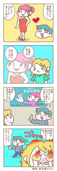 彼氏は、その女優が好きというだけで、U子さんを疎かにすることはありません。デート先はU子さんの行きたい場所を優先してくれ、話も親身になって聞いてくれます。愛情表現もたっぷりです。それでも、U子さんは嫉妬心を抑えられません。なぜならば、彼氏が好きという女優とU子さんは「全く似ていない」からです。