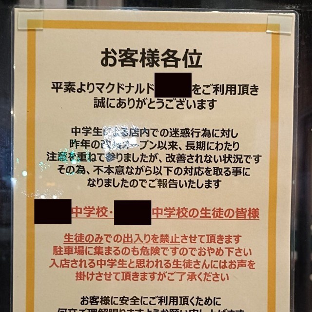 マクドナルドが中学校2校「出入り禁止」「長期にわたり注意を重ねてまいりましたが」店舗に出禁貼り紙