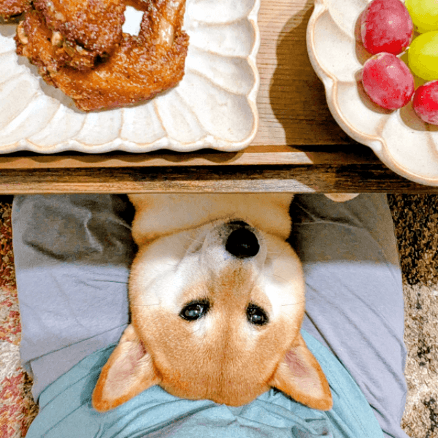 「ひと口、くれませんか?」食卓の下から届く柴犬の“キラキラの瞳”に1.8万いいね しばらくするとそのままの格好で眠ってしまい…