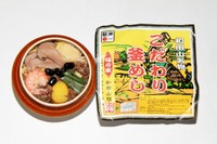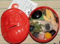 高崎名物のだるまをほうふつさせる丸いおかずは三つ。梅漬けはサクサクと歯応えよく梅干しほどの酸っぱさはない。甘い栗の甘露煮と、真っ白なウズラの卵まで量がしっかりあってお腹一杯になること間違いなしだ。