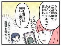 ランチの途中で、別のママ友Yさんがスマホを取り出して息子の服装相談を始めました。大学生の息子に服装の指示をする母親だなんて!…Fさんは気まずいものを見てしまったような衝撃を受けながらも「きっと息子さんにとっては、母が最強のスタイリストなんだろうな」と妙に納得してしまいました。