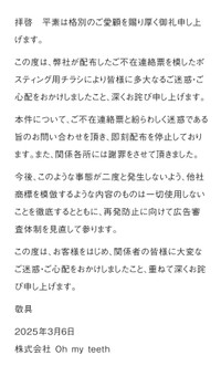 発端は、郵便物内にチラシを見つけた東京都内の男性が、X上に「Oh my teeth」のチラシを投稿したことだった。