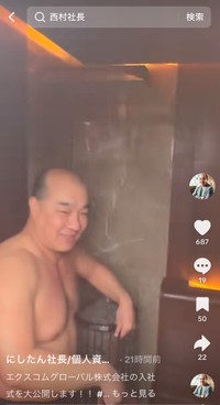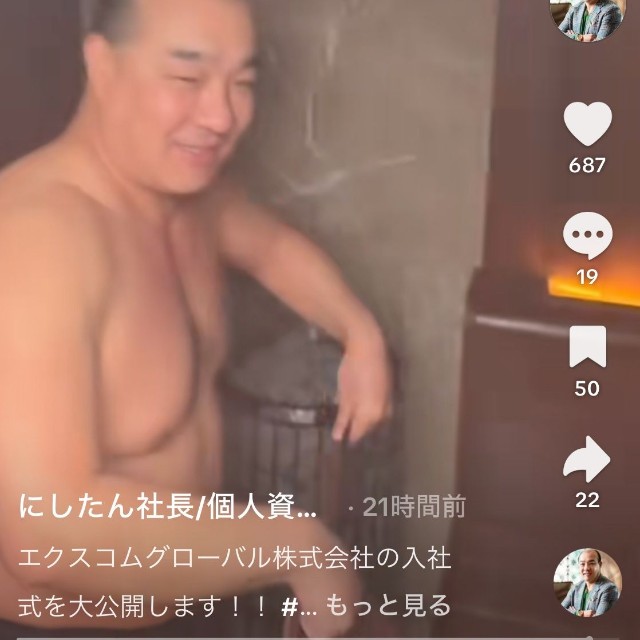 入社式が〝超ド派手〟!?美容クリニック「にしたんクリニック」や通信サービス「イモトのWiFi」などを展開するエクスコムグローバル株式会社の入社式が、TikTok上で注目を集めている。入社式が行われたのは、東京都内にある総工費30億円の西村誠司社長(54)の自宅。高級シャンパンで乾杯するほか、西村社長が男性新入社員と露天風呂に入浴するなど、型破りな様式で新入社員を喜ばせた。