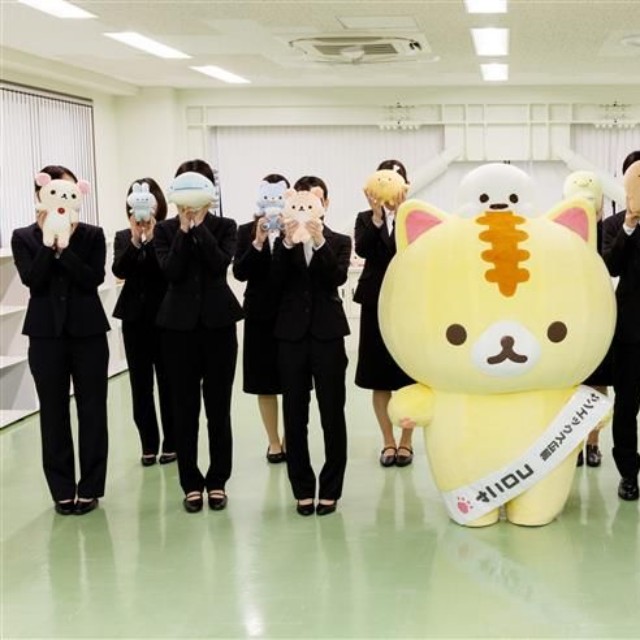 入社式はサンエックスのキャラクターであり広報も務めている「コロニャ」を中心に新入社員が並び、それぞれが「リラックマ」や「すみっコぐらし」のキャラクターマスコットで顔を隠してポーズ。それぞれ違うキャラクターの顔ぶれが見られ、和やかな雰囲気を感じさせる一枚となった。