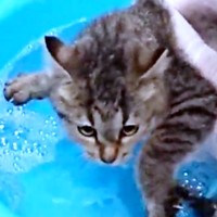 「かわいらしい声で鳴き、すぐに触ったり抱っこしたりさせてくれました。その日は祝日だったため、病院へは翌日連れて行くことに。お風呂に入れると、お湯は真っ黒になりました。その後は、ケージの中へ。私が家事を終わらせて、よもぎの様子を見に行くと、夫が抱っこして座っていました(笑)」