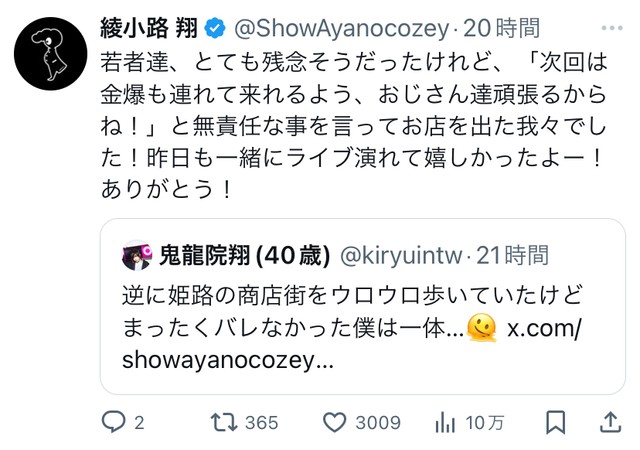 「ゴールデンボンバーさんですよね?」→"翔"違いのバンドリーダー、間違えられるも神対応「さすがの懐」「思いやりが素敵」