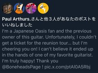 若い頃からオアシスのファンだった男性は、「私は日本のオアシスファンで、ギターの前の持ち主です。残念ながら再結成ツアーのチケットは取れませんでしたが…応援しています!大好きなギタリストの手に渡るなんて信じられません。本当に嬉しいです!」とポール・アーサーズさんにメッセージを送った。すると後日、「いいね」ボタンを押してくれ、ギター業者も喜びを反応してくれた。