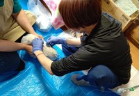 この日「ののいち にゃんこのおうち」で引き取ったのは、ひときわ痩せていた2匹。1匹は2カ月前に出産したという母猫のシロちゃん(推定8歳)で、体重は1.7キロ。ひどい下痢でした。もう1匹のウメちゃん(推定4歳)も体重は2.1キロ。また2匹とも貧血だったとか。