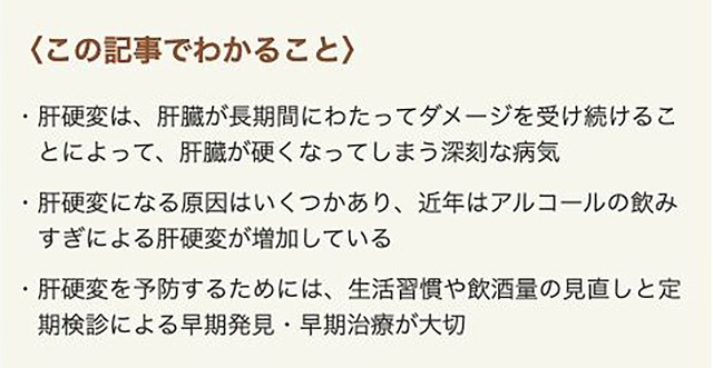 肝硬変は、一度発症すると治療方法がほとんどなく、放置していると命に関わる病気です。また、肝臓は、異常が起きていても自覚症状がでにくく、何らかの症状があるときにはすでに病気が進行していることがほとんどです。肝硬変の発症の原因には、肝炎ウイルスによるものや過度な飲酒によるものなど、いくつかの原因が存在しますが、肝臓の異常を早期に発見し、できるだけ早期に適切な対処をすれば肝硬変を予防したり、進行を遅らせたりすることができます。この記事では、肝硬変の原因や症状、検査方法や予防方法などについて詳しく解説します。