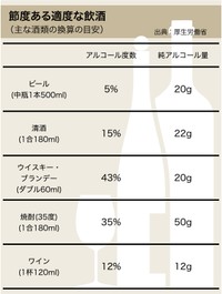 長期にわたるアルコールの摂取によって、肝臓の細胞破壊が進行し、やがて肝硬変に至るものです。通常、少量のアルコールを摂取しても肝臓を傷めることはあまりありませんが、日本酒換算で1日3合、ビール大ビン3本、ウイスキーシングル6杯以上のアルコールを5年以上にわたって摂取しつづけていると、肝臓に深刻なダメージを与え、肝硬変に移行するリスクが高くなります。