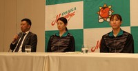 新加入のアライザ ジェイ・ソロモン(フィリピン)も会見途中から登壇し、「フィリピンで培ったものを連覇に向けて発揮したい」「アピールしたいのはブロック。アタックでも強みを見せていきたい」と185センチの高さを生かした活躍を期した。
