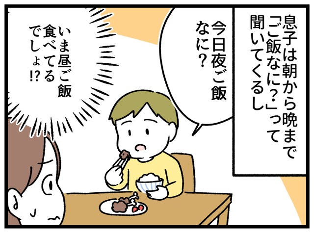 定期考査前で部活も休み、一日中家にいる息子にとって、食事が唯一の楽しみなのかもしれません。しかし母としては「今まさに朝ごはんを食べている最中なのに、もう昼のこと?」という気持ちになります。