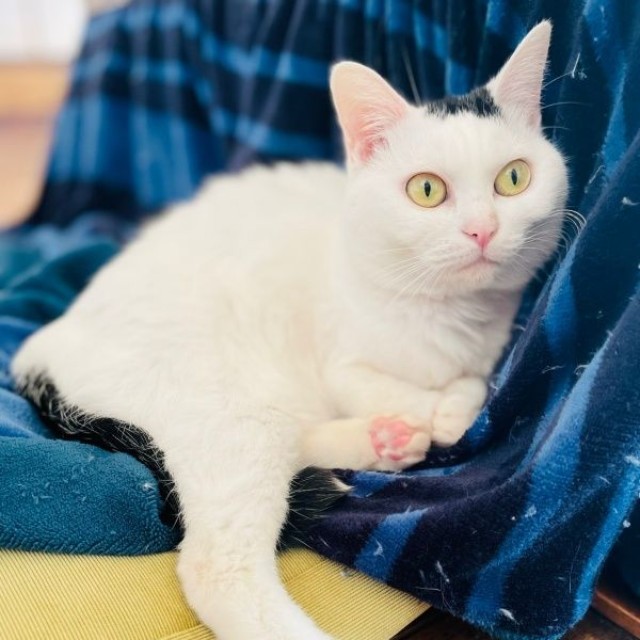 黒と白の被毛をもつぺーちゃんは、頭のてっぺんの一部が黒く、真っ白なお顔とあいまって、お顔が小さなおにぎりのように見える個性派さん。さらに、ボディは真っ白で、尻尾だけが黒いという特徴も併せ持っています。