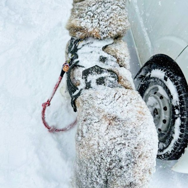 「午前中、車でいつもの散歩コースに行こうと思いましたが、ひどい吹雪でホワイトアウト状態だったので、これは危険だと判断し、道中にある市役所の駐車場に避難しました。しばらくして、そばにある公園で散歩しましたが、激しい突風で純の顔は真っ白に。私の手はかじかみ、スマホにも雪がついてうまく作動しない状況でした。車に戻って中に入ろうとしたところ、『帰りたくない!』とフリーズ状態に。何とか車に乗ってもらって家に着いたものの、すぐ中に入ろうとせず、敷地内でゆったり過ごしているところを撮影した動画です。純は気温がマイナス20度近くになったときも、凍った路面に寝そべって1時間ほど過ごすので、雪の中で動かなくなることは珍しくありません。夏は苦手で、車から降りたがらなくなるので、外で動かなくなるのは冬限定ですね」