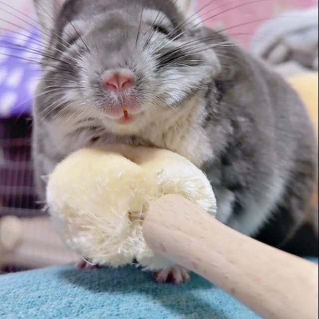そんなコメントが添えられた動画が人気を集めています。映っているのは、チンチラの「プリン」さん(7歳・女の子)です。プリンちゃんの主食は、牧草のチモシー。飼い主さんがひとふさ、プリンちゃんにあげると、パクッと口で受け取り、そのままもぐもぐと食べ始めます。
