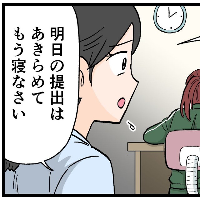 「Y葉の進捗をチェックすると、どう考えてもあと数時間で終わる量ではない。しばらく見守っていましたが、深夜2時を回った時点でたまらず声をかけました。自業自得だ、中学生が起きていていい時間じゃない。明日の提出はあきらめて、今日はもう寝なさい、と」