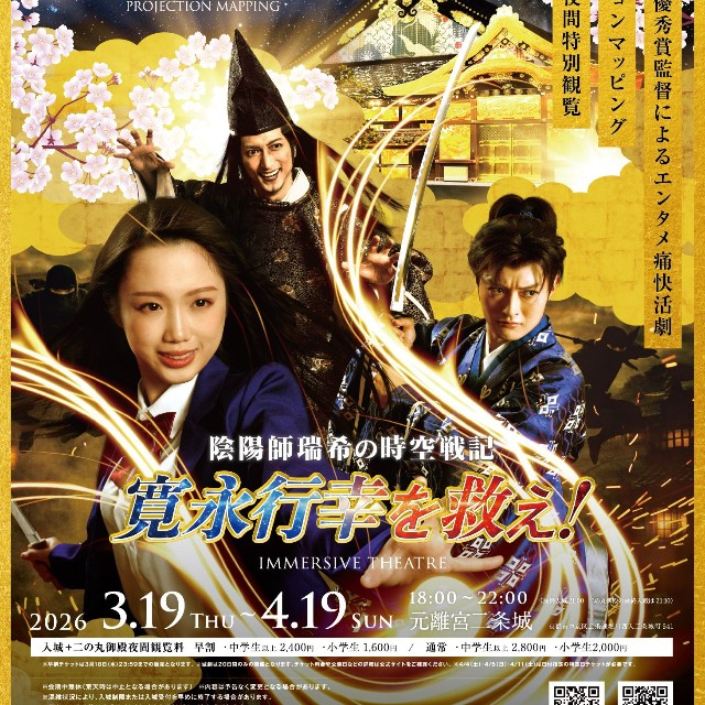 AI、最新テクノロジー、そして生身の俳優が織り成す迫力のパフォーマンス「城劇 陰陽師瑞希の時空戦記 寛永行幸を救え!」は期間中、1日2公演(18時45分〜19時20分/20時〜20時35分)。チケットは入城料金と観劇のセットで中学生以上3400円、小学生2600円(いずれも前売、平日開催分)など。未就学児は無料だが、座席使用の場合は小学生料金で購入する。休演日など詳しい情報は公式サイトで。