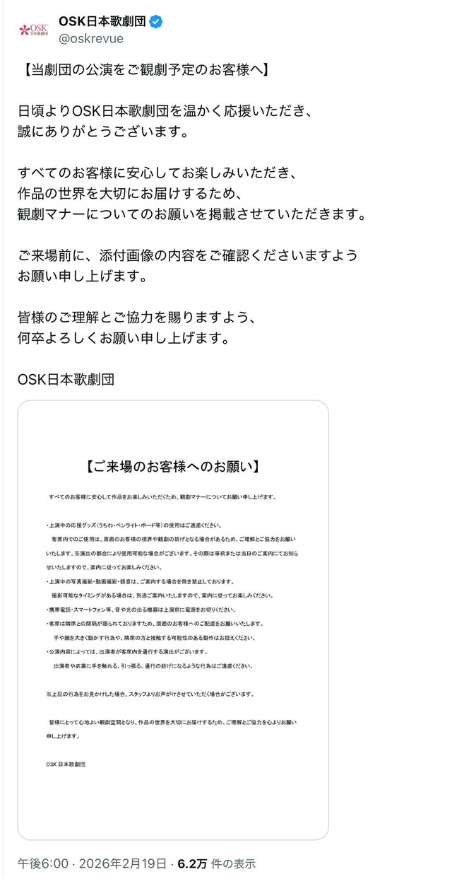 「応援うちわの使用」「出演者に触れる行為」はやめて OSK日本歌劇団、観劇マナーに関する注意喚起 「ライブじゃないんだから」
