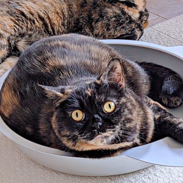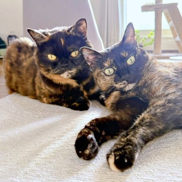 「めいちゃんはとにかく食いしん坊ですが、よもぎが自分のご飯を食べようとすると譲ってあげる優しさもあります。よもぎもそんなめいちゃんを慕って自分から甘えに行ったり、めいちゃんが爪切りで抱っこされていると、助けようとして(?)人間の足に爪研ぎ攻撃をしてくることもあるんですよ」