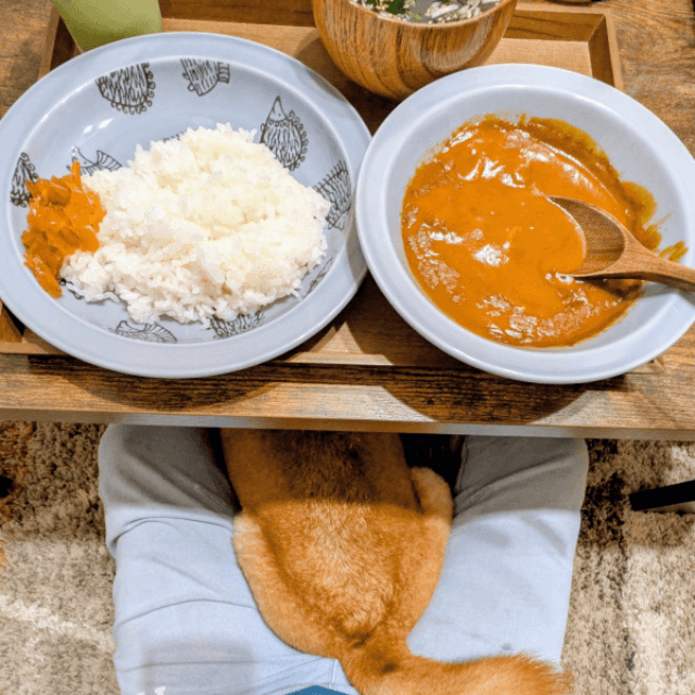 「2年ほど前からするようになったのですが、きっかけは不明です。食事中から離席するまで、ずっとこの状態ですね。飼い主の顔が見えることや、足の間に挟まる安心感があるのかもしれません」