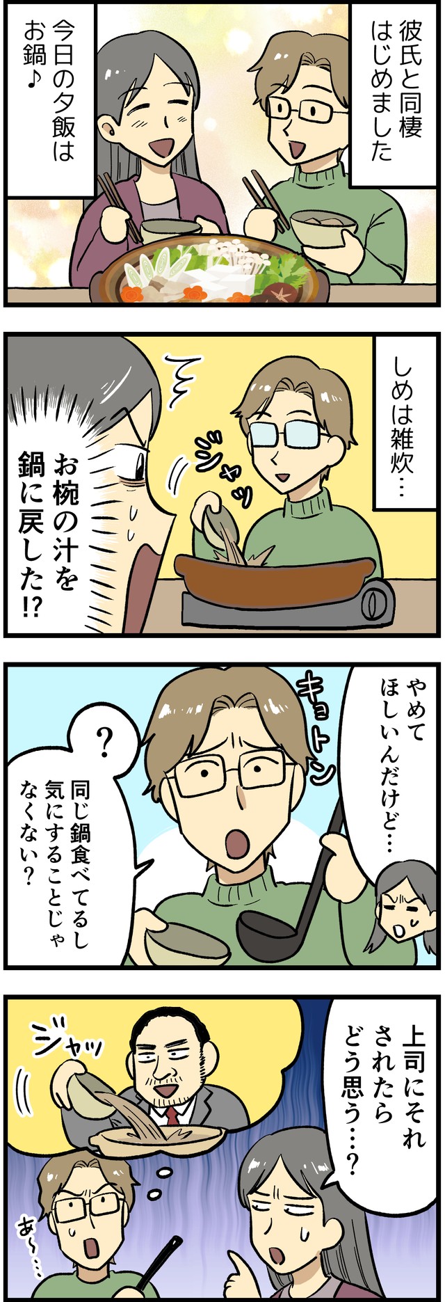 【漫画】鍋のシメの直前、お椀の汁を大鍋に戻す彼氏!ひえええ(全編を読む)