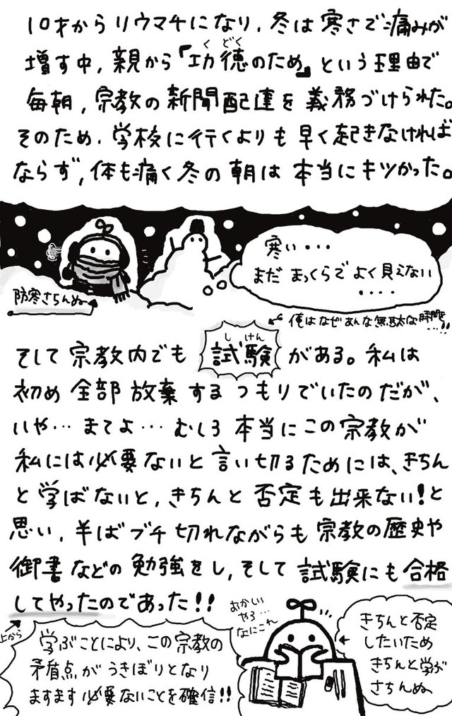 さちんぬさんの両親や親族は、仏教系の宗教を信仰。両親は幹部だった。幼い頃には正座で長時間の読経を強いられ、宗教の新聞を配らされた。