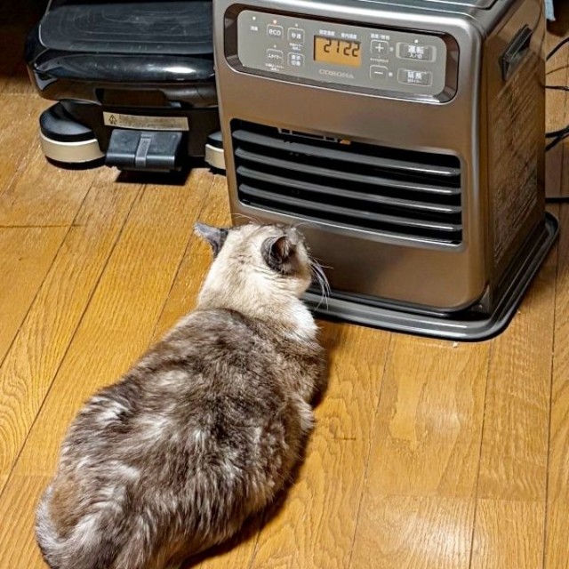 「シャム系のぴーちゃんは保護時すでに大人だったけど、保護した3年前よりこんがりしたような? と思ったらいつもファンヒーターの前で自らあぶられてたんだったw」